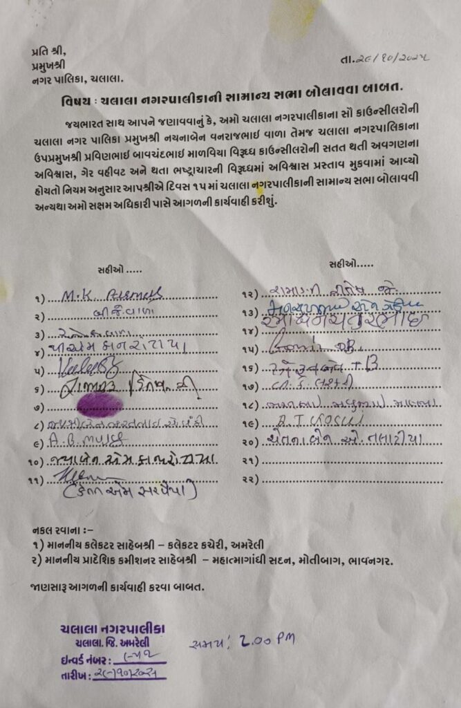 In Amreli district, due to corruption within the BJP, infighting has reached its peak. In the Chalala Municipality, 20 out of 24 elected members have submitted a no-confidence motion against the President and Vice-President. The President has failed to hold regular general body meetings. In the last seven months, only one budget meeting was called, and no other general meeting has been held since then. As a result, elected members have been excluded from decisions regarding development and administration.