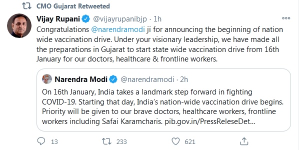 On vaccination drive for Coronavirus Gujarat chief minister Vijay Rupani congratulated Prime Minister Narendra Modi for this initiative through twitter.