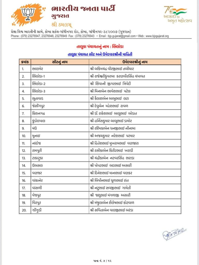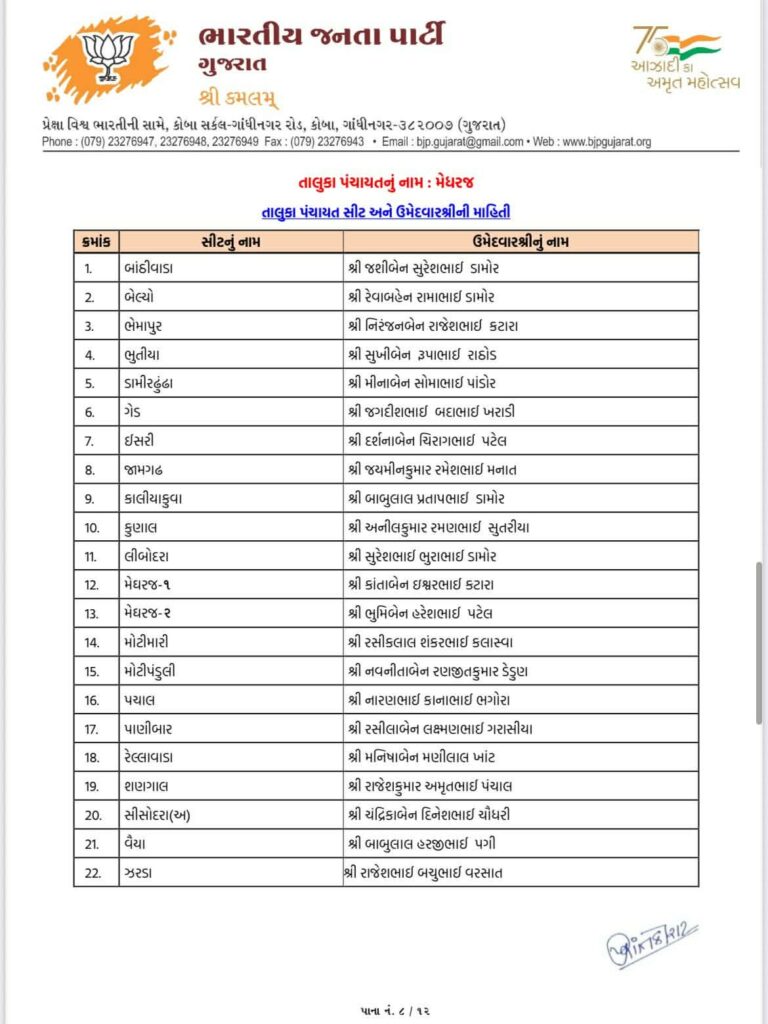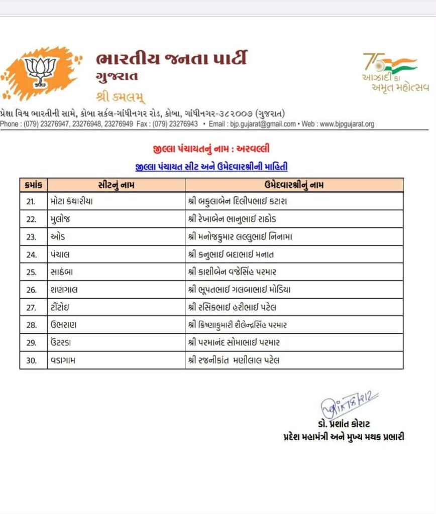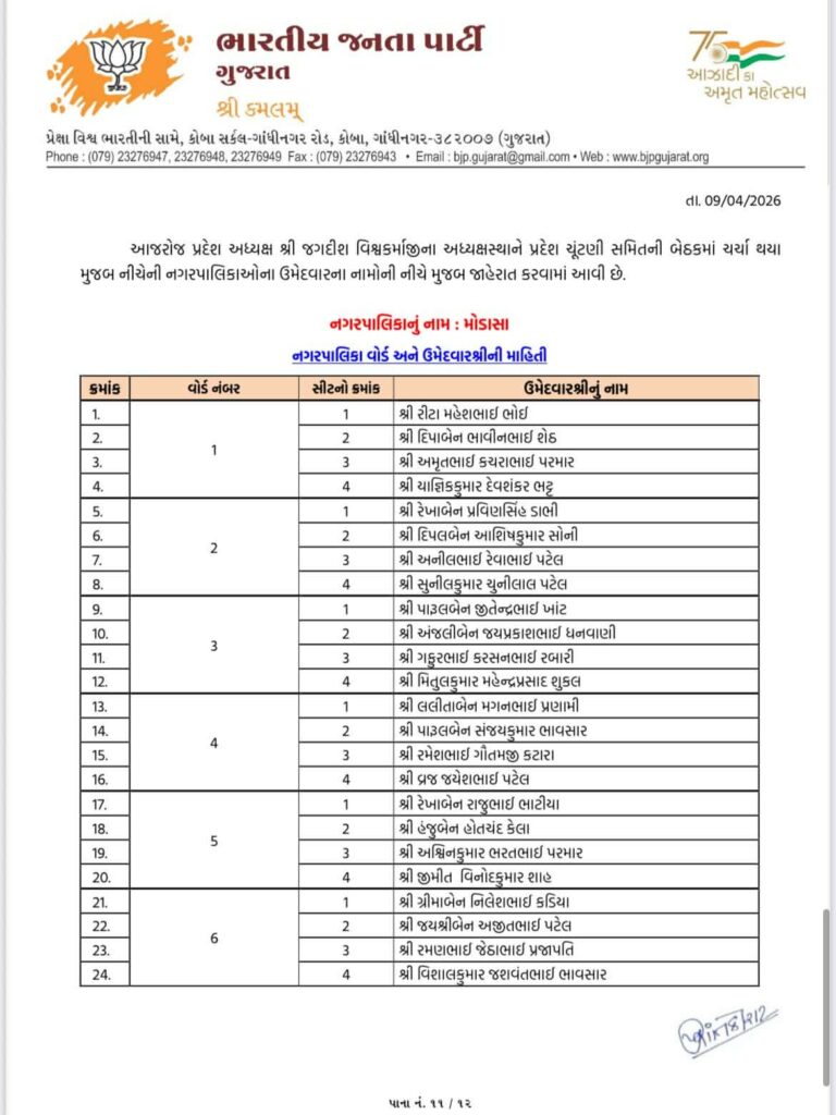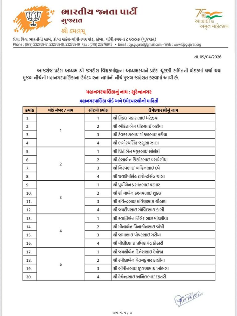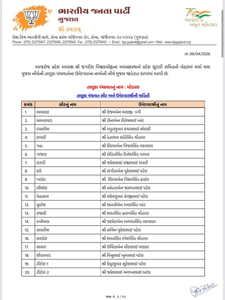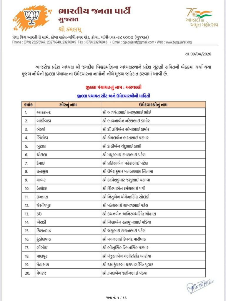 Ahead of local body elections 2026 today Gujarat BJP Bharatiya Janta Party has declared list of candidates of Aravalli Jilla Panchayat, Modasa Taluka Panchayat, Bhiloda Jilla Panchayat, Bayad Jilla Panchayat, Dhansura Jilla Panchayat, Malpur Jilla Panchayat, Meghraj Jilla Panchayat, Shamlaji Jilla Panchayat, Sathamba Jilla Panchayat, Modasa Nagar Palika, Bayad Nagar Palika and Surendranagar Maha Nagar Palika.