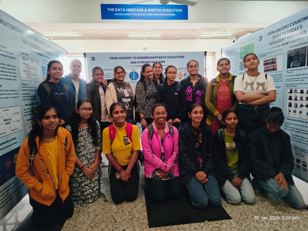 Ahmedabad, 6th February, 2026:Navgujarat College of Computer Applications, part of the Navgujarat group of colleges, organized an informative exhibition titled “Data Odyssey and Digital Evolution.” The Exhibition was inaugurated on campus by distinguished alumni of the institution, Ms. Jharna Advani, along with the respected College Trustee Shree Snehal Shah. The event aimed to enhance students’ awareness and understanding of the journey of data and its growing significance in the digital era.