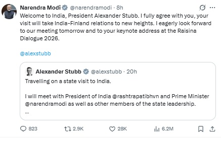 “Welcome to India, President Alexander Stubb. I fully agree with you, your visit will take India-Finland relations to new heights. I eagerly look forward to our meeting tomorrow and to your keynote address at the Raisina Dialogue 2026.